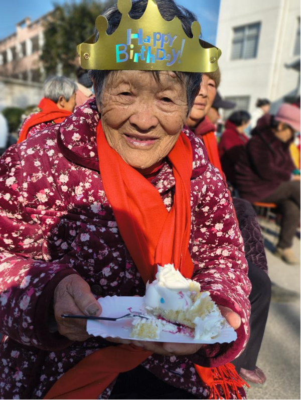 另一侧的庆生区更是暖意融融。工作人员推来装饰精美的大蛋糕,为老人们一一戴上“生日快乐”皇冠。82岁的李奶奶捧着蛋糕,笑得像个孩子:“这辈子还是第一次和这么多老姐妹一起吃蛋糕庆生,这蛋糕甜到心坎里了!”鲜红的围巾绕在老人们的脖颈间,与雪白的奶油、金黄的蛋糕相映成趣。快门声此起彼伏,定格下一张张幸福的笑脸。