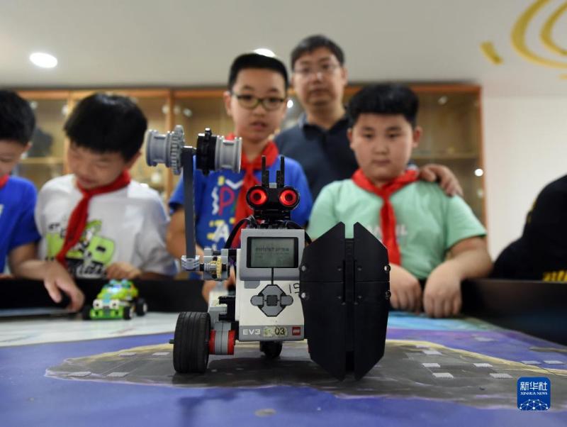 在合肥市和平小学,信息技术老师杨森(右二)在“课后三点半”时间指导机器人社团的学生(2021年9月8日摄)。新华社记者 周牧 摄