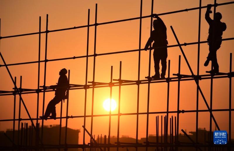 2022年1月1日,在河北雄安新区容西安置房项目D标段施工现场,中铁上海工程局工人在新年第一缕阳光的照耀下工作。新华社发(傅新春 摄)