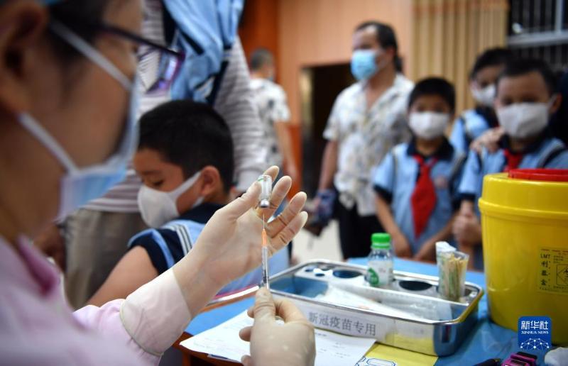 医护人员在海口市琼山第三小学为学生接种疫苗(2021年10月28日摄)。新华社记者 郭程 摄