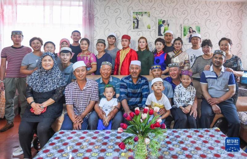 这是家住内蒙古呼伦贝尔的夏民山(前排右三)家的家庭合影。他家由回族、汉族、蒙古族、达斡尔族、鄂温克族、满族共6个民族组成,45口人,三代同堂(2017年7月16日摄)。新华社记者 连振 摄