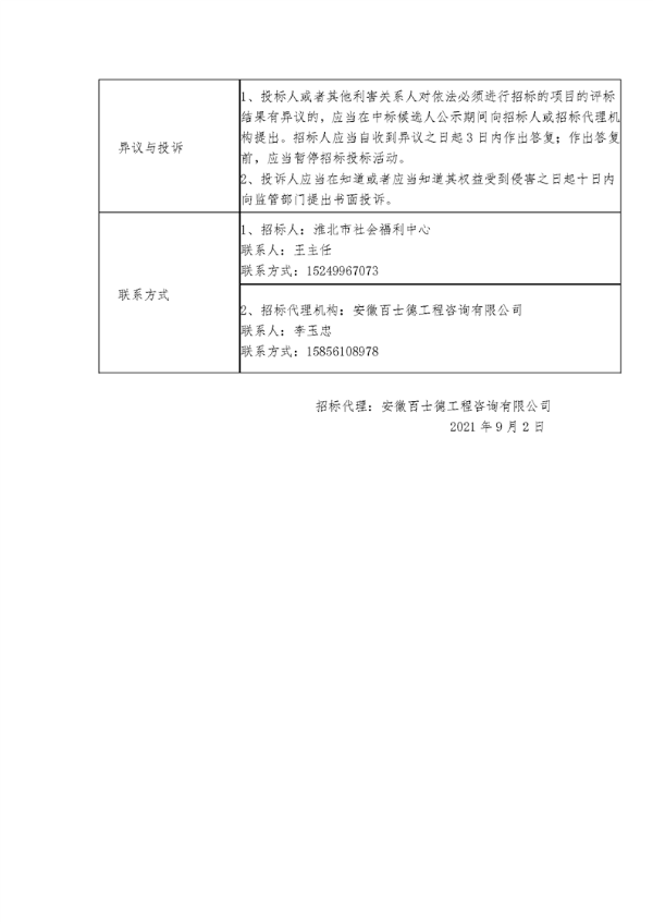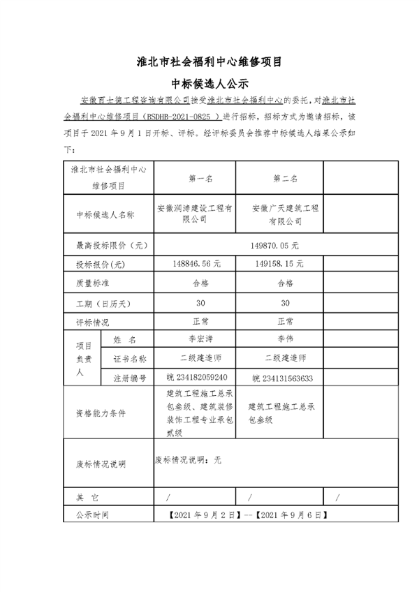 淮北市社会福利中心维修项目中标候选人公示